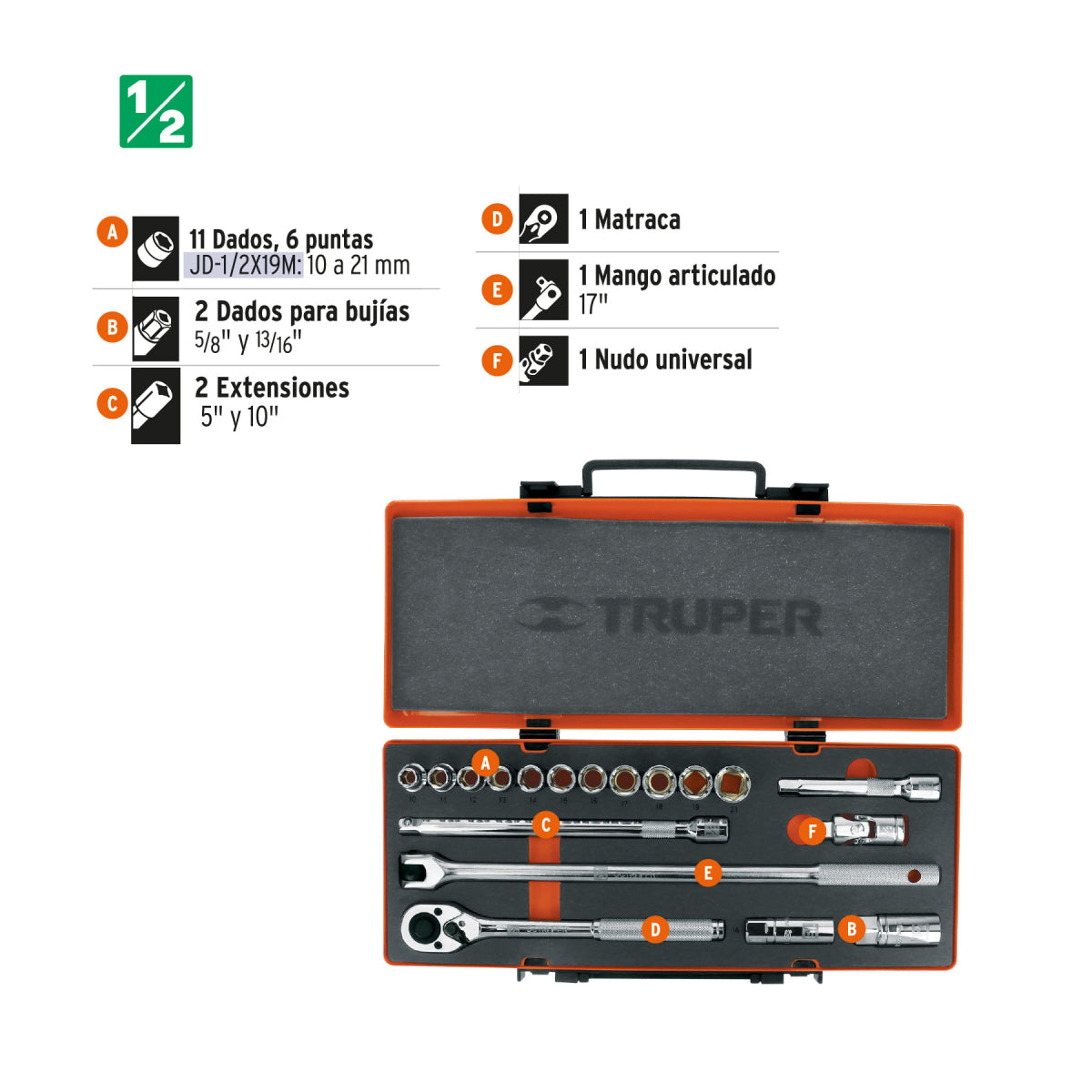 Juego de 18 herramientas cuadro 1/2" mm para mecánico, Truper