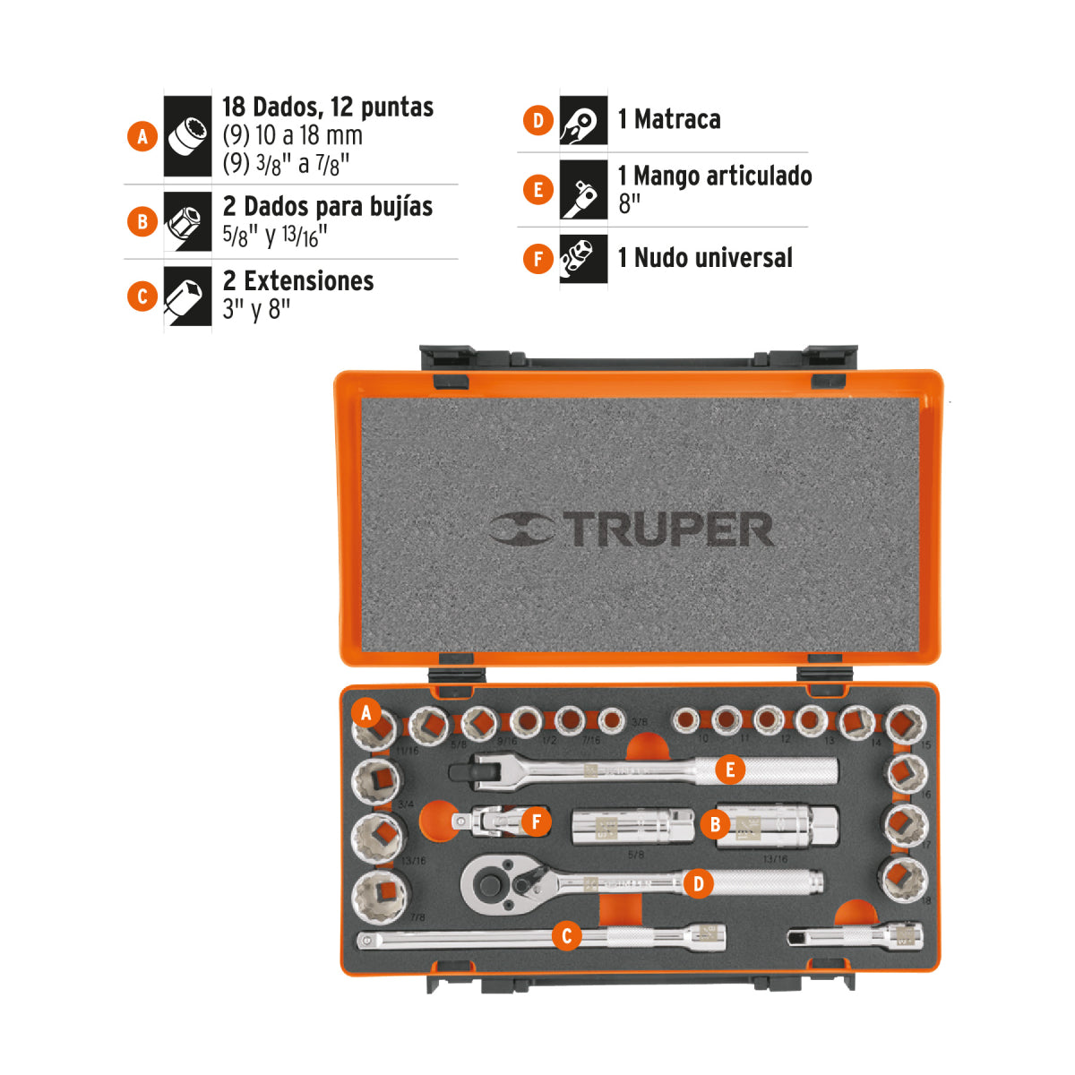 Juego de 25 herramientas cuadro 3/8" std y mm para mecánico, Truper